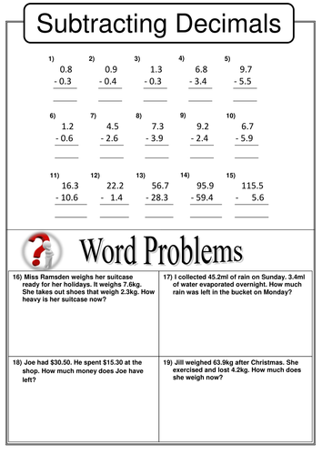 Math worksheets adding and subtracting decimals. Adding and Subtracting Fraction Worksheets - Math Salamanders Welcome to our Adding and Subtracting Fraction Worksheets page. Here you will find a wide range of free printable fraction worksheets as well as a video and support page about Adding and Subtracting Fractions with like denominators to help your child learn and practice this 3rd grade skill. Decimals Addition & Subtraction for Grade 5 - K5 Learning 5th grade adding and subtracting decimals worksheets, including adding 1 and 2 decimal digits, adding decimals in columns, subtracting 1 and 2 decimal digit numbers and subtracting decimals in columns. No login required. Adding and Subtracting Decimals - Math is Fun Adding decimals is easy when you keep your work neat. To add decimals, follow these steps: Write down the numbers, one under the other, with the decimal points lined up; Put in zeros so the numbers have the same length (see below for why that is OK) Then add, using column addition, remembering to put the decimal point in the answer Adding and Subtracting Integers Worksheets This assortment of adding and subtracting integers worksheets have a vast collection of printable handouts to reinforce performing the operations of addition and subtraction on integers among 6th grade, 7th grade, and 8th grade students.
