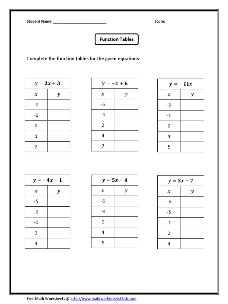 Function Table & In and Out Boxes Worksheets - Math-Aids.Com Function Table Worksheets These Function Table Worksheets are great for giving students practice in computing the outputs for different linear equations. You may select between four different types of equations. These Function Table Worksheets will generate 12 function table problems per worksheet. These Function Table Worksheets are appropriate for 4th Grade, 5th Grade, 6th Grade, and 7th Grade.